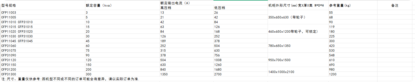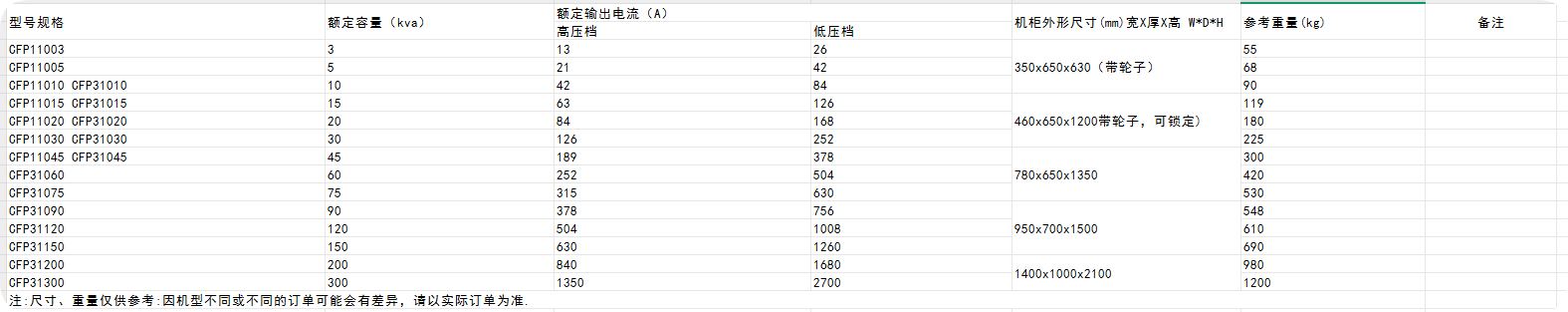 | 型號(hào) | 額定容量?(KVA) | 額定輸出電源(A) | 機(jī)柜外形尺寸 | 備注 | |